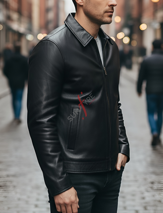 Matt Black Cafe Racer Leather Jacket For Men Sheepskin (SF624)