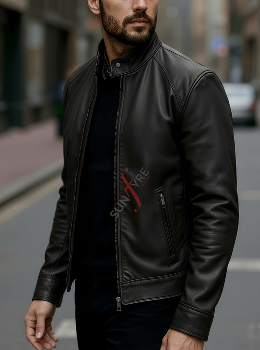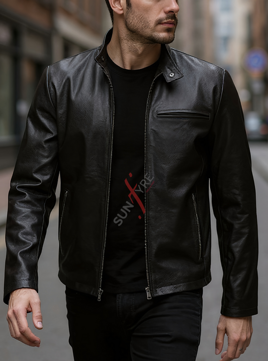 Black Cafe Racer Leather Jacket For Men Real Sheepskin (SF120)