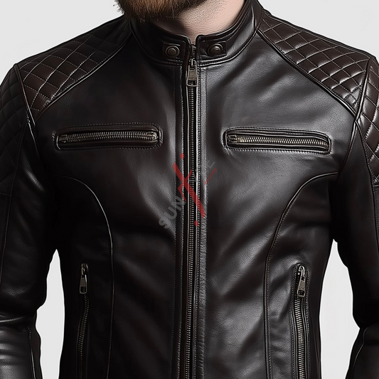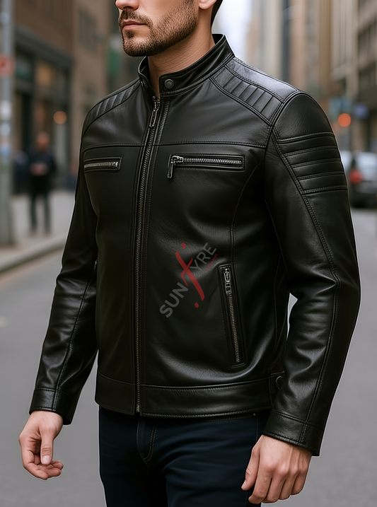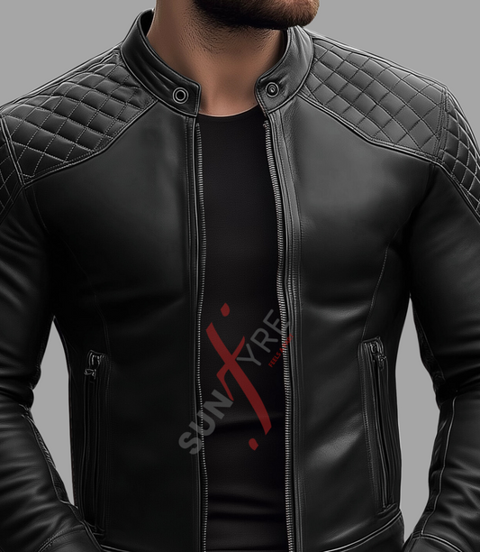 Quilted Sheepskin Black Cafe Racer Leather Jacket For Men (SF117)