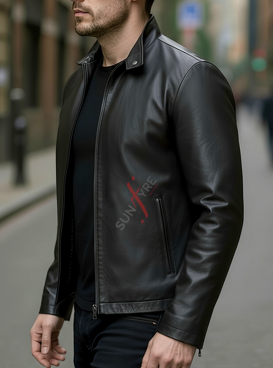 Matt Black Cafe Racer Leather Jacket For Men Sheepskin (SF624)