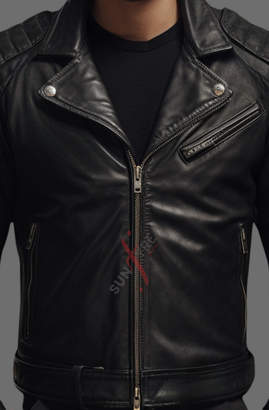 Black Belted Motorcycle Leather Jacket For Men (SF137)