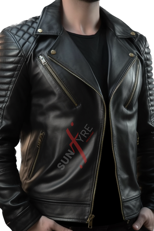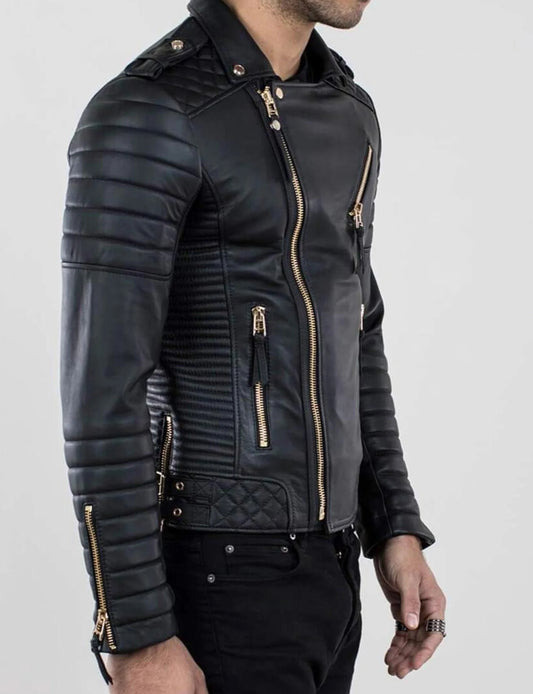 Black Quilted Motorcycle Leather Jacket For Men (SF565)