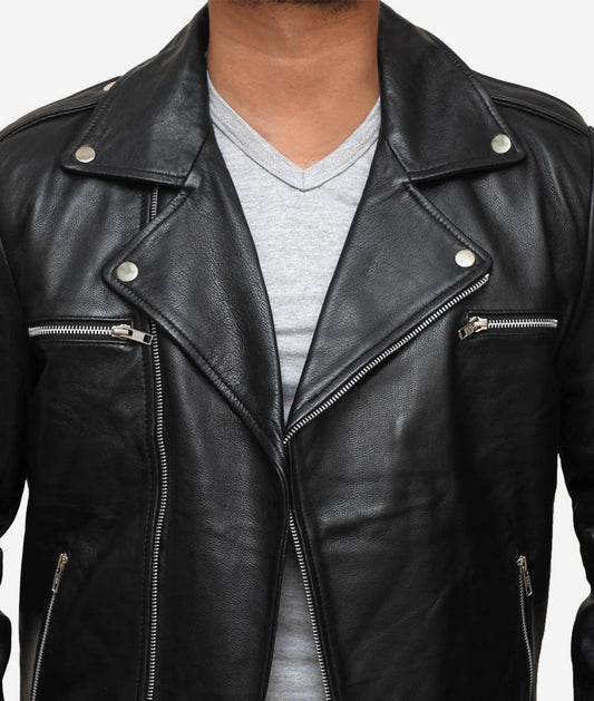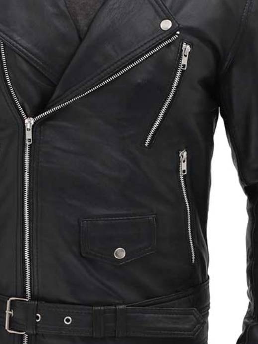 Black Asymmetrical Belted Motorcycle Leather Jacket For Men (SF129)