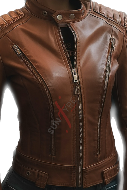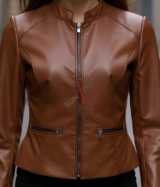 Tan Cafe Racer Leather Jacket For Women Real Sheepskin (SF371)