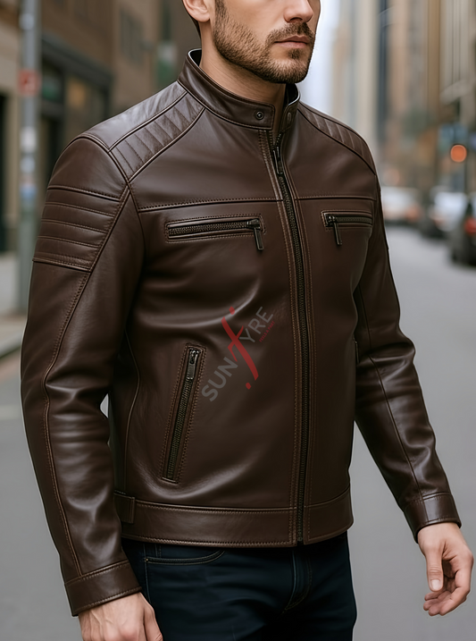 Cafe Racer Brown Leather Biker Jacket For Men in Real Sheepskin (SF158)