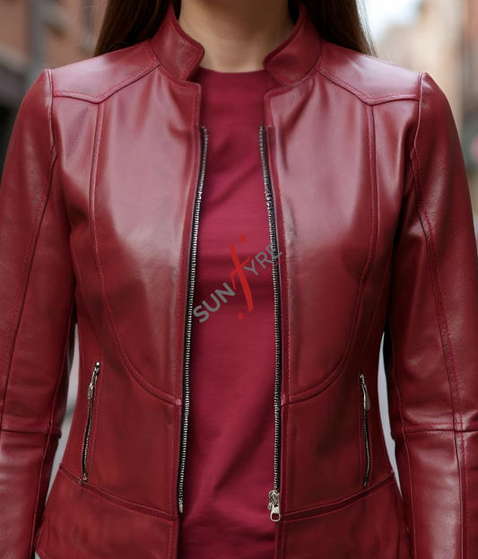 Women’s Slim Fit Cafe Racer Distressed Burgundy Leather Jacket (SF154)
