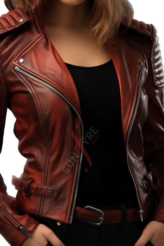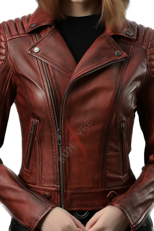 Quilted Burgundy Distressed Leather Motorcycle Jacket For Women (SF355)