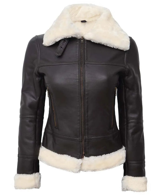 Brown Bomber Shearling Leather Jacket For Women in Real Sheepskin (SF155)