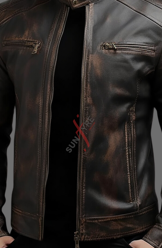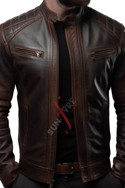 Distressed Cafe Racer Brown Leather Biker Jacket For Men Real Sheepskin (SF111)
