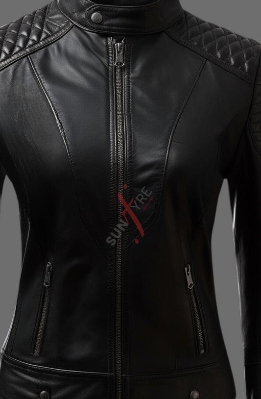 Quilted Dark Black Leather Jacket For Women Real Sheepskin (SF382)